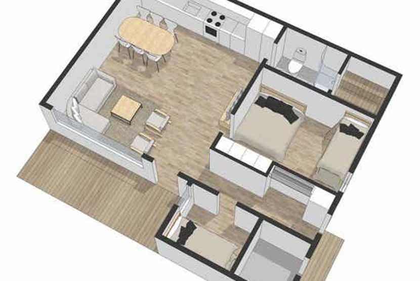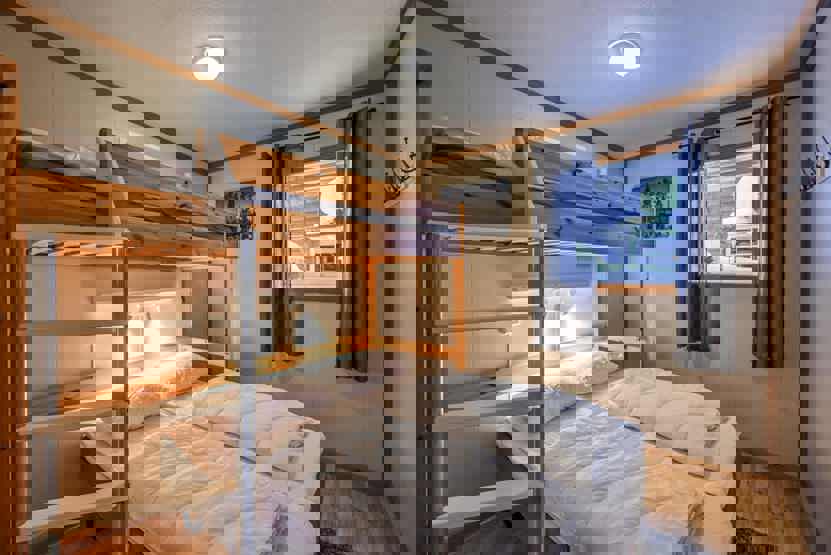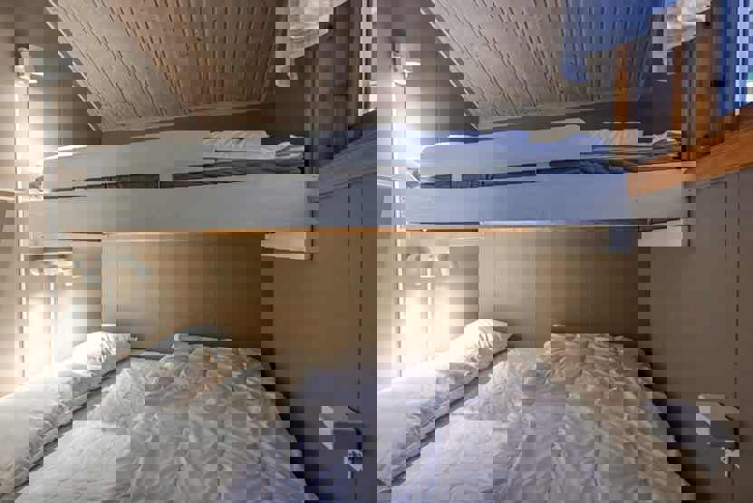 Soveværelse 1: 1 dobbeltseng og en overkøje. Soveværelse 2: 1 køjeseng med 120 cm bred underkøje.