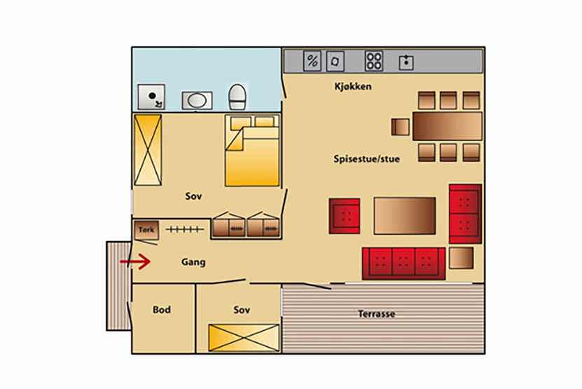 Soveværelse 1: 1 dobbeltseng, 1 køjeseng. Soveværelse 2: 1 køjeseng.