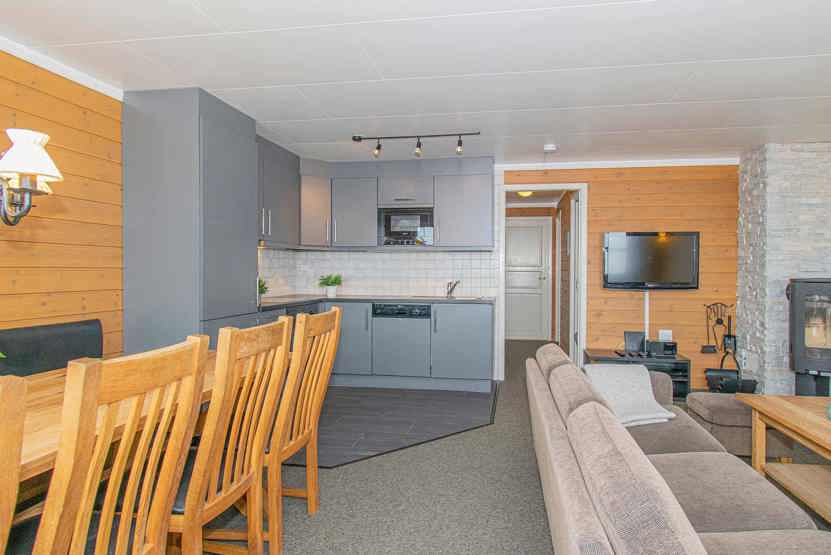 Fjellblikk 32. Lejlighed til dig i stueetage. Moderne og flot lejlighed med 8 sengepladser, 65 m², køkkenafdeling, opholdsstue, pejs, TV, 3 soveværelser, 1 bruser, 2 WC. Skiopbevaring, tørrerum, 1 garageplads.