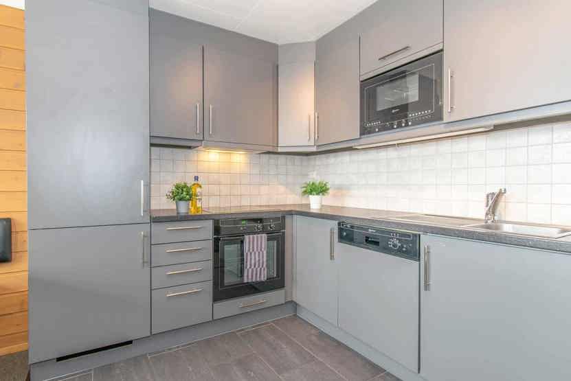 Enheden har komfur med ovn, opvaskemaskine, mikrobølgeovn, køleskab, fryser.