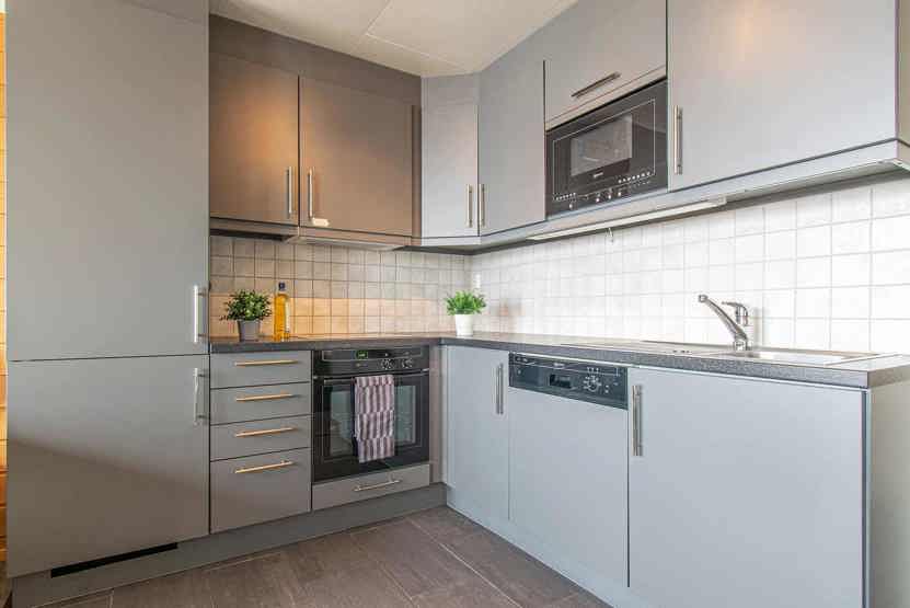 Enheden har komfur med ovn, opvaskemaskine, mikrobølgeovn, køleskab, fryser.