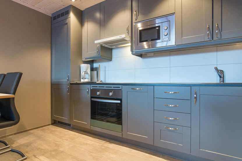 Enheden har komfur med ovnopvaskemaskine, mikrobølgeovn, køleskab, fryser.