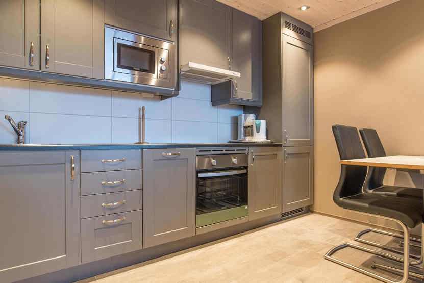 Enheden har komfur med ovnopvaskemaskine, mikrobølgeovn, køleskab, fryser.
