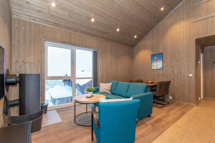Fjellheim 47. Familievenlig moderne lejlighed på 1 sal med 4 sengepladser, 49 m², køkkenafdeling, lille opholdsstue, pejs, TV, 2 soveværelser, 1 bruser, 1 WC. Skiopbevaring, 1 skotørrer.