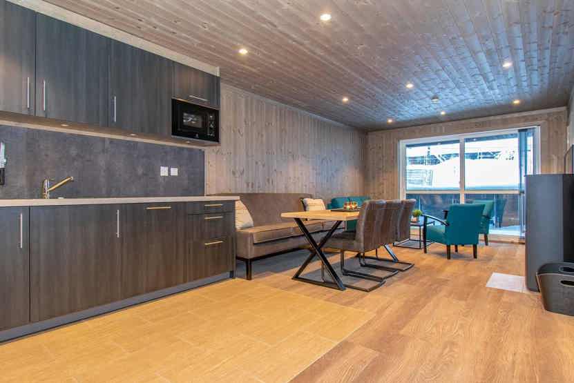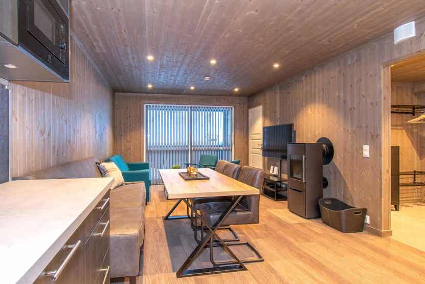 Fjellheim 48. Familievenlig moderne lejlighed i stueetage med 7 sengepladser, 76 m², køkkenafdeling, opholdsstue, pejs, TV, 3 soveværelser, 2 brusere, 2 WC. Skiopbevaring, 1 skotørrer.