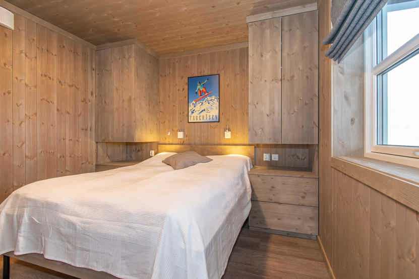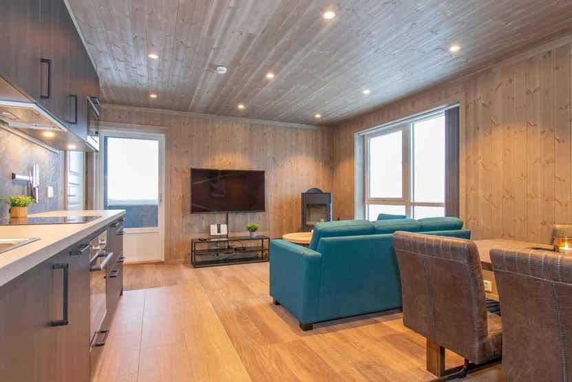 Fjellheim 49. Familievenlig moderne lejlighed i stueetage med 4 sengepladser, 49 m², køkkenafdeling, lille opholdsstue, pejs, TV, 2 soveværelser, 1 bruser, 1 WC. Skiopbevaring, 1 skotørrer.