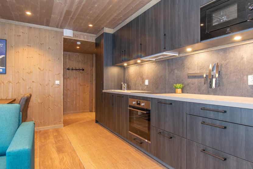 Enheden har komfur med ovn, opvaskemaskine, mikrobølgeovn, køleskab, fryser.