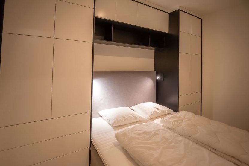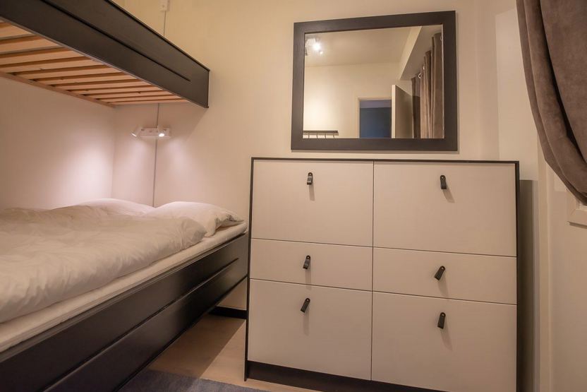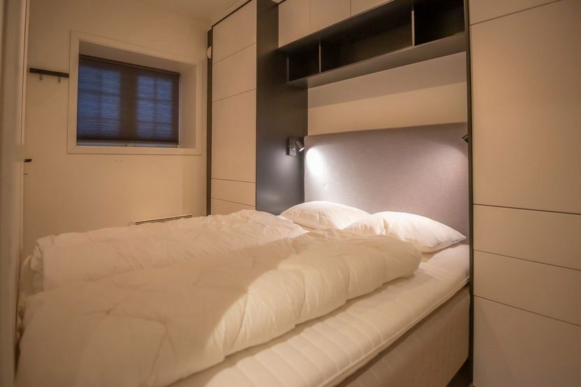 Soveværelse 1: 1 dobbeltseng 150 cm bred. Soveværelse 2: 1 familiekøjeseng med 120 cm bred underkøje og 90 cm bred overkøje.