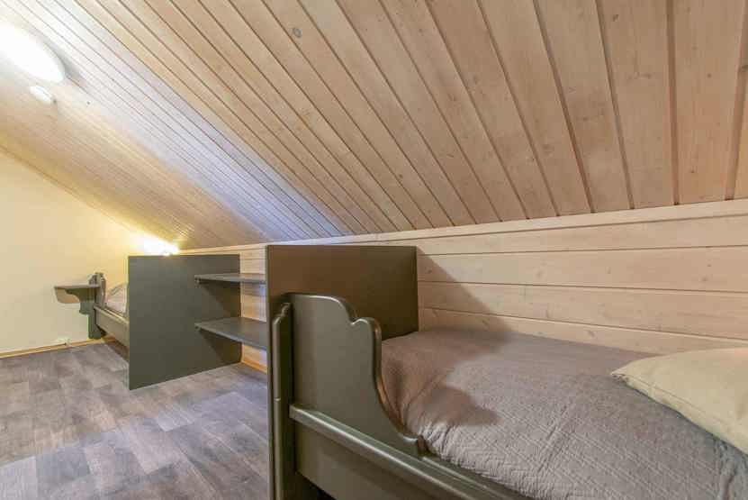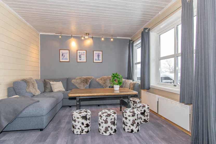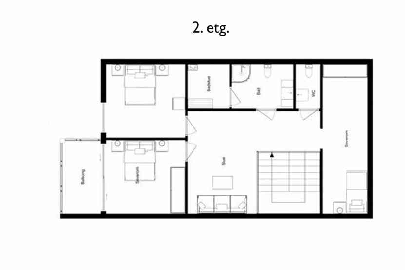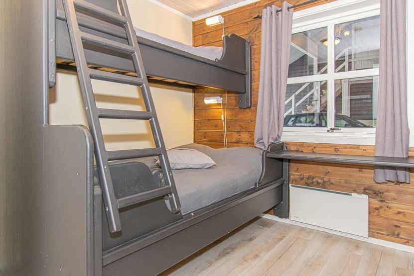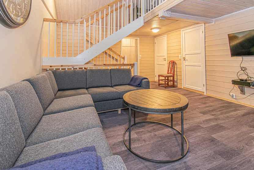1 sal. Mindre TV-stue med sofa, 2 soveværelser, 1 sovealkove. 1 badeværelse med 1 bruser, 1 WC, sauna. Separat WC.