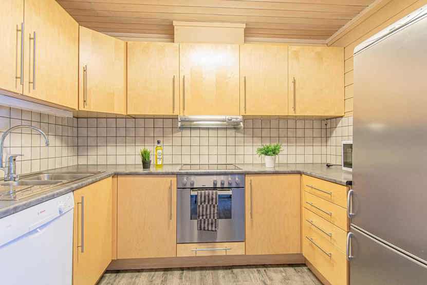 Køkken: Enheden har komfur med ovn, opvaskemaskine, mikrobølgeovn, køleskab, fryser.