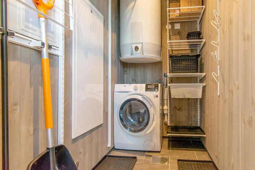 kombineret vaskemaskine/tørretumbler, tørrerum, skiopbevaring.