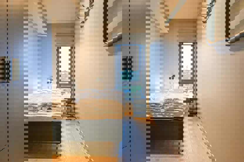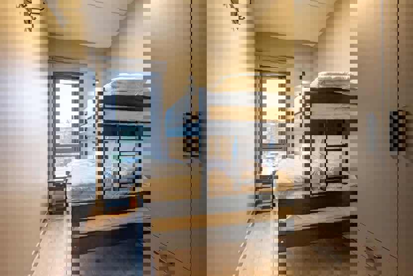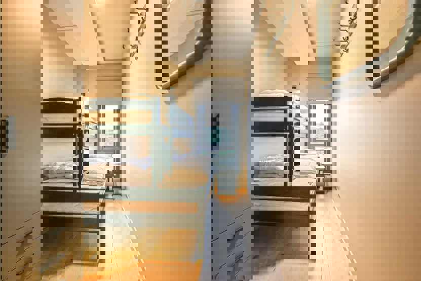 Soveværelse 1: 1 dobbeltseng 180 cm bred. Soveværelse 2+3: 1 familiekøjeseng med 150 cm bred underkøje og 90 cm bred overkøje. Soveværelse 4: 1 dobbeltseng 140 cm bred.