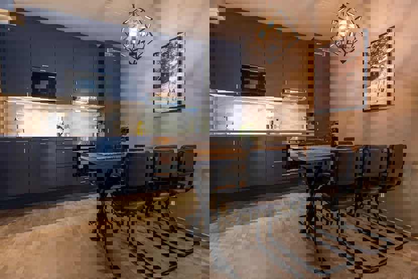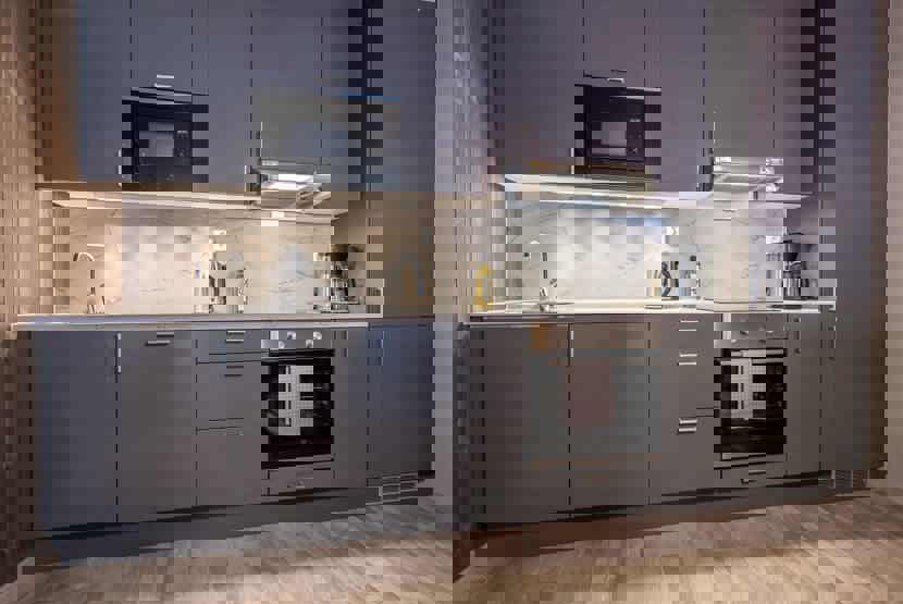 Køkken: Enheden har komfur med ovn, køleskab, fryser, opvaskemaskine, mikrobølgeovn.