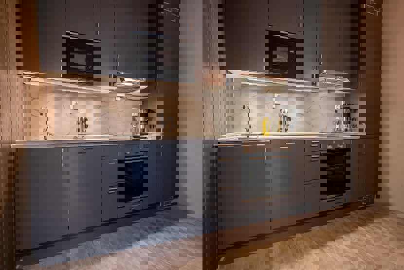 Køkken: Enheden har komfur med ovn, køleskab, fryser, opvaskemaskine, mikrobølgeovn.