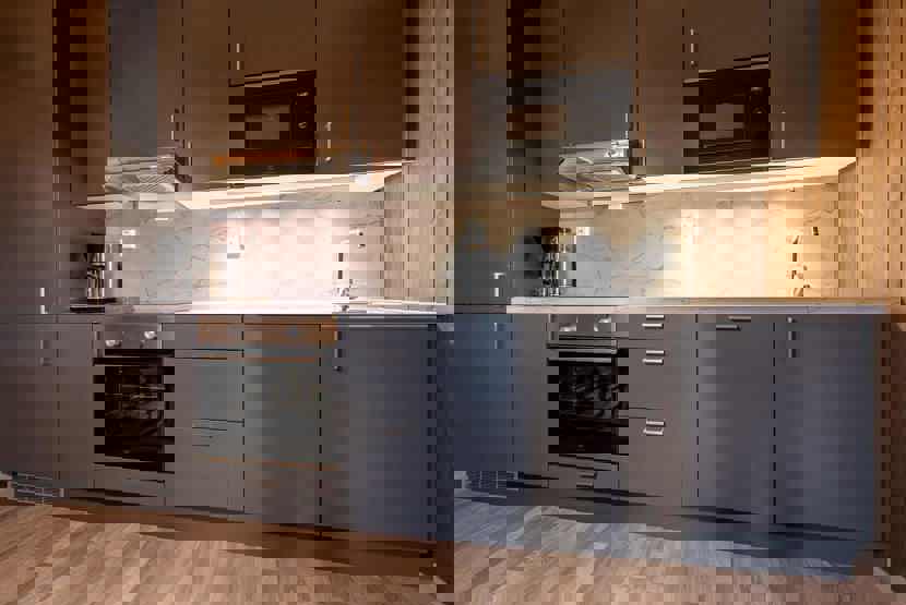 Køkken: Enheden har komfur med ovn, køleskab, fryser, opvaskemaskine, mikrobølgeovn.