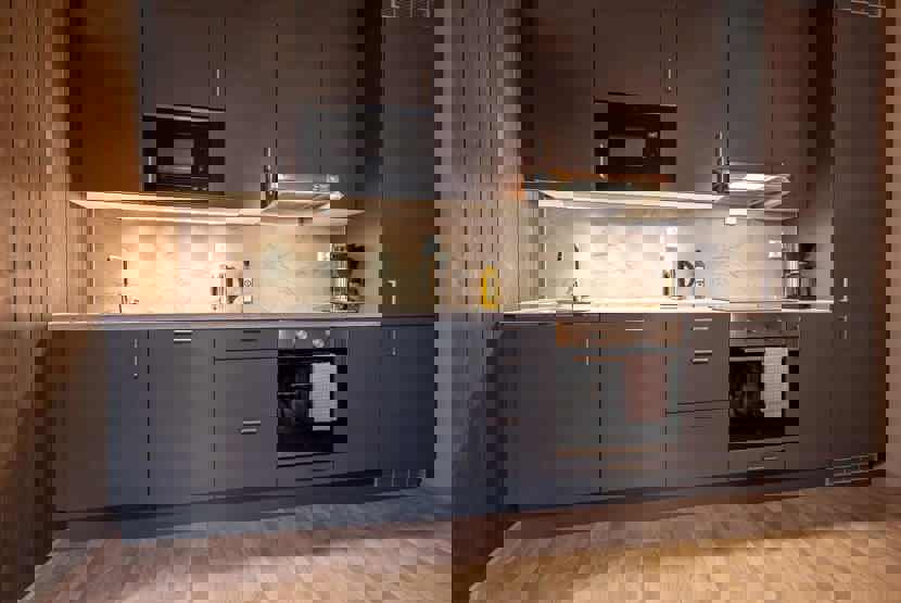 Køkken: Enheden har komfur med ovn, køleskab, fryser, opvaskemaskine, mikrobølgeovn.