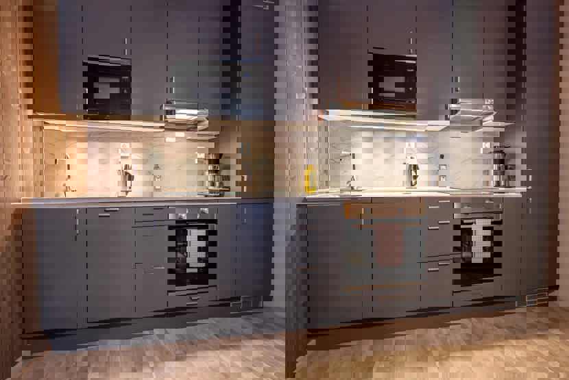 Køkken: Enheden har komfur med ovn, køleskab, fryser, opvaskemaskine, mikrobølgeovn.