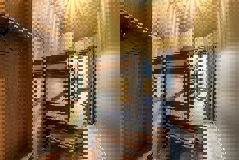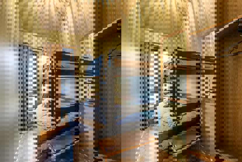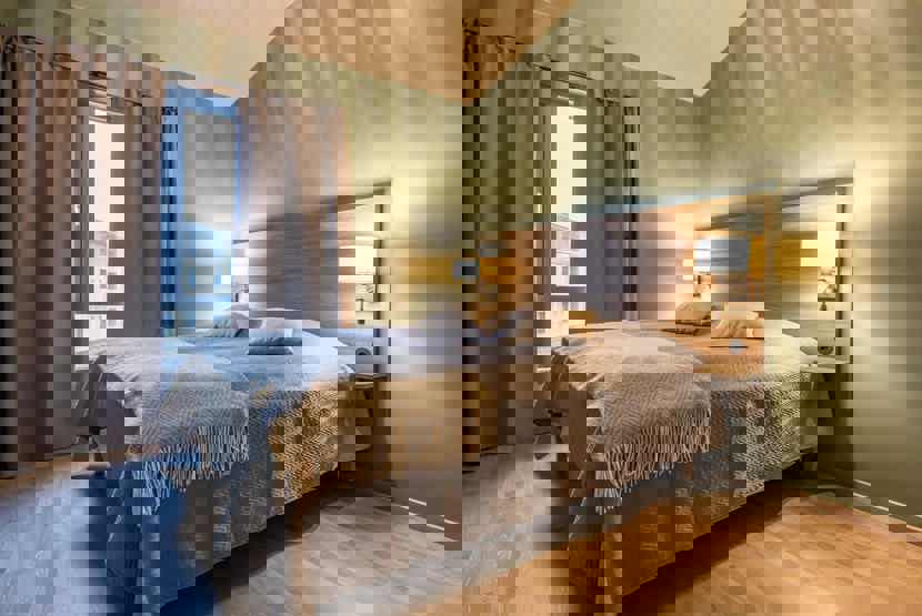 Soveværelse 1: 1 dobbeltseng 160 cm bred. Soveværelse 2+3: 1 familiekøjeseng med 120 cm bred underkøje + 75 cm bred overkøje.
