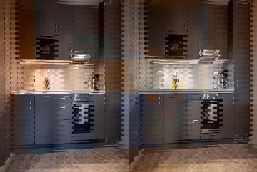 Køkken: Enheden har komfur med ovn, køleskab, fryser, opvaskemaskine, mikrobølgeovn.