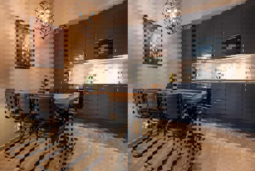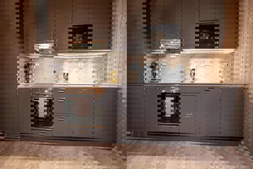 Køkken: Enheden har komfur med ovn, køleskab, fryser, opvaskemaskine, mikrobølgeovn.