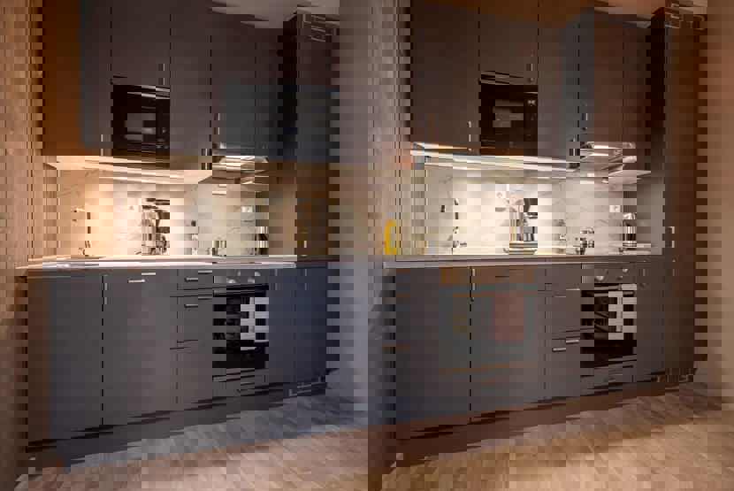 Køkken: Enheden har komfur med ovn, køleskab, fryser, opvaskemaskine, mikrobølgeovn.