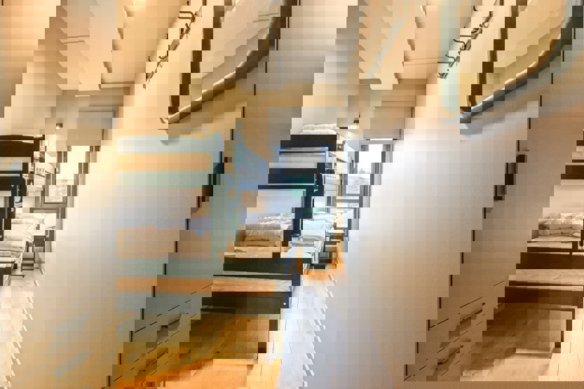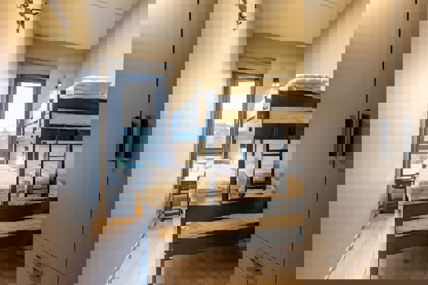 Soveværelse-1= 1 dobbeltseng 180 cm bred, 1 køjeseng 90 cm bred. Soveværelse-2= 1 køjeseng med 150 cm bred underkøje og 90 cm bred overkøje. Soveværelse-3= 1 køjeseng med 150 cm bred underkøje og 90 cm bred overkøje. Soveværelse-4= 1 dobbeltseng 140 cm bred.