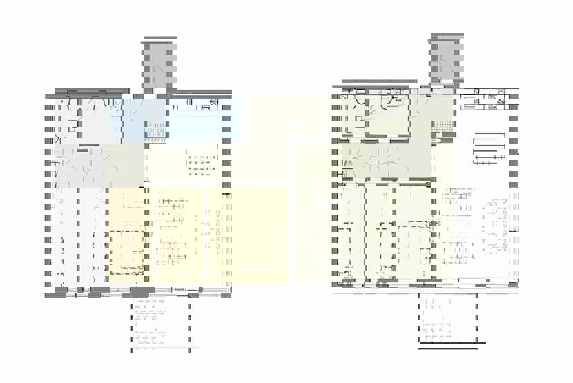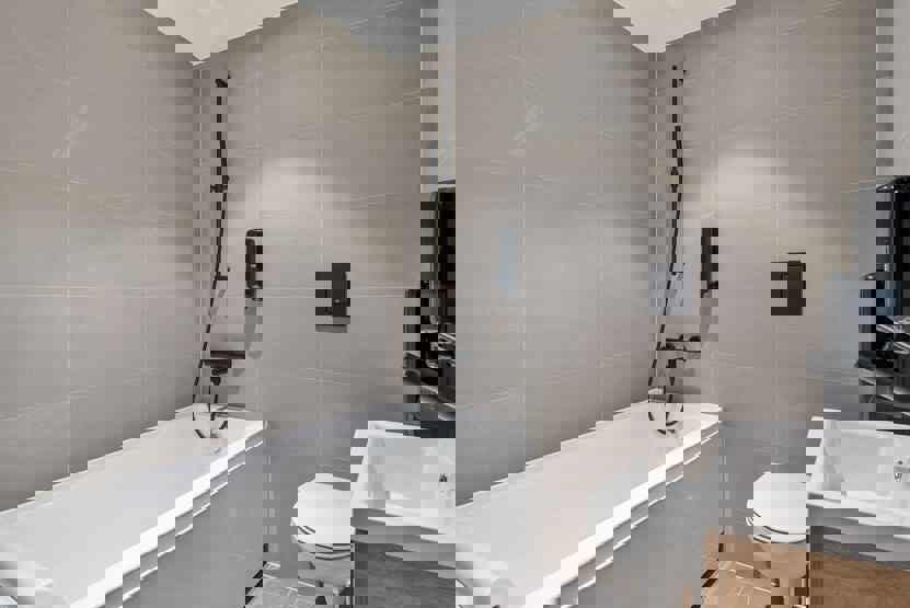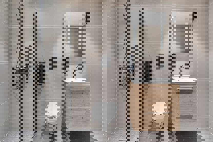 Bad 1 med bruser, WC og badekar. Bad 2 med bruser og WC.