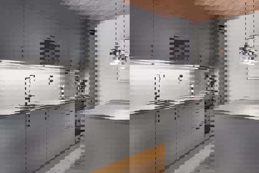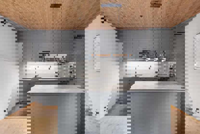 Enheden har køleskab, fryser, opvaskemaskine, mikrobølgeovn.