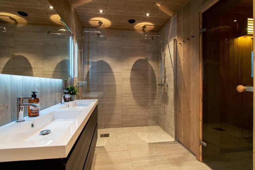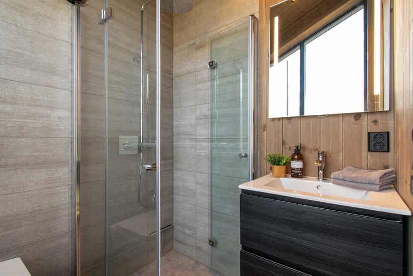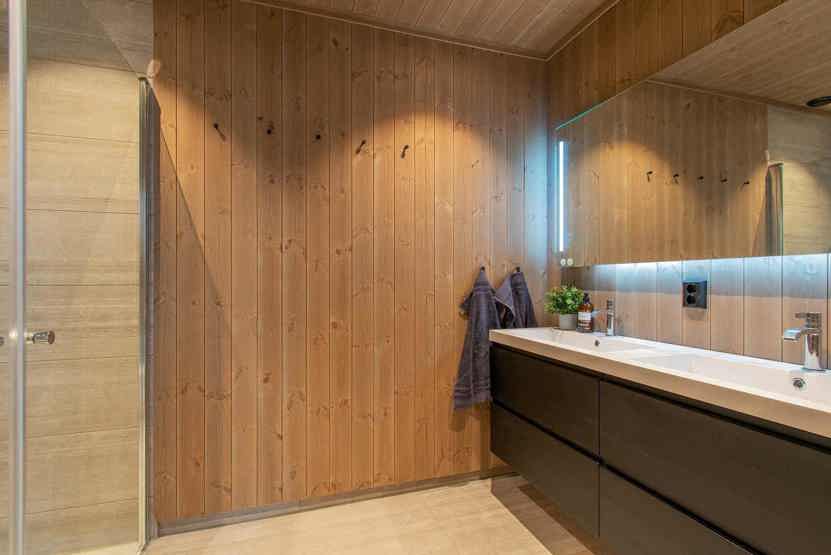 Bad 1: 2 brusere, (dobbelt brusebad) WC og sauna. Bad 2: Bruser og WC. Bad 3: Bruser og WC.