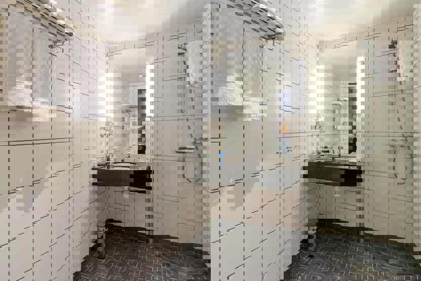 Bad 1 med bruser, WC og badekar. Bad 2 med bruser og WC. Bad 3 med bruser og WC.