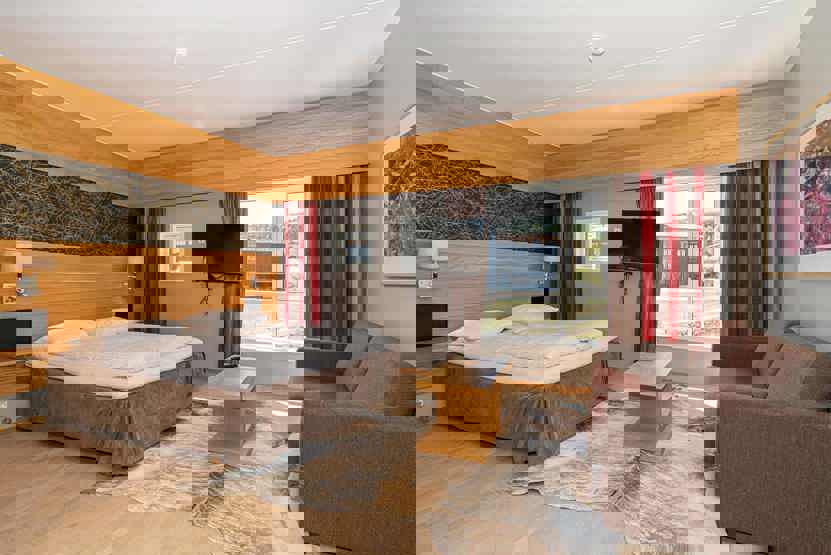 Fra skirummet er der direkte udgang til pisten. 1. klasses betjening i super lækre rammer. Eventyrbad med SPA afdeling med finsk sauna og tyrkisk dampbad mod betaling, Klatrevæg i glas m.m., 6 restauranter og barer, 8 bowlingbaner.