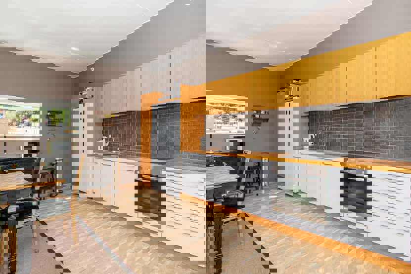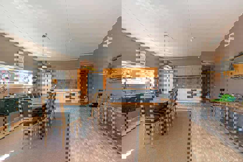 Enheden har komfur, ovn, opvaskemaskine, fryser, køleskab.