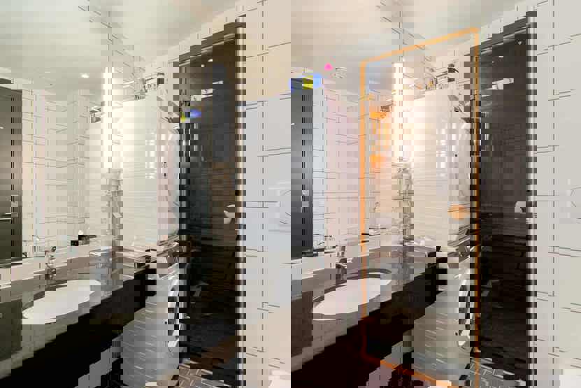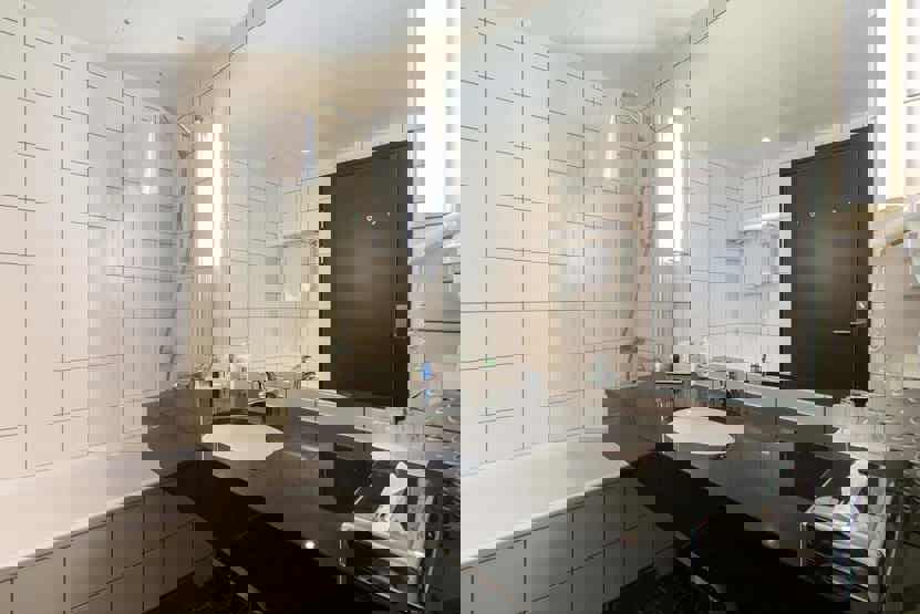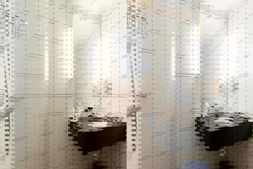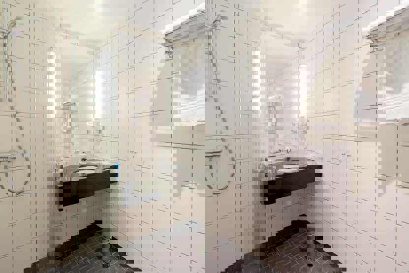 Bad 1 med bruser, WC og badekar. Bad 2 med bruser og WC. Bad 3 med bruser og WC.