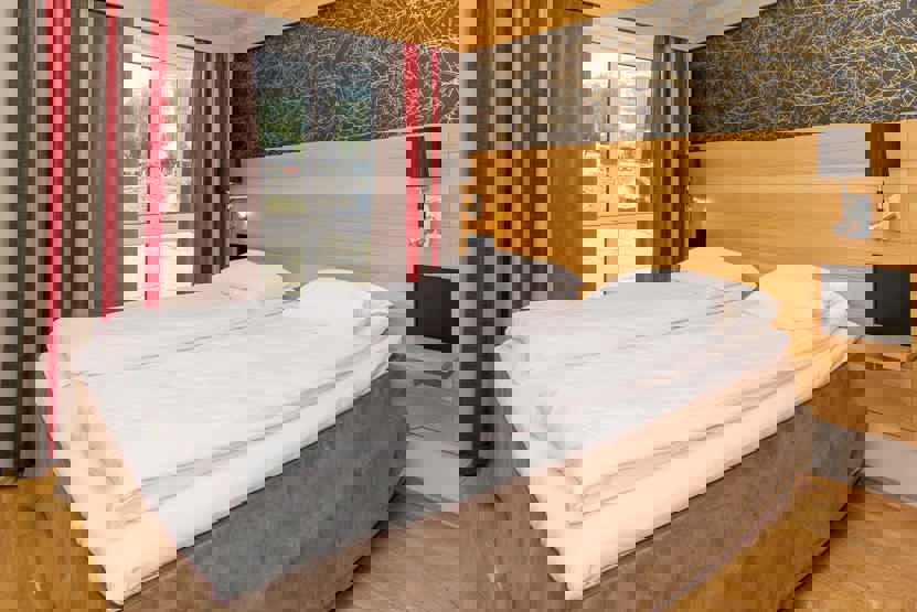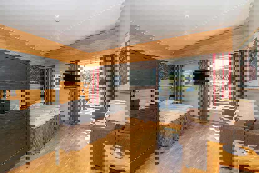 Fra skirummet er der direkte udgang til pisten. 1. klasses betjening i super lækre rammer. Eventyrbad med SPA afdeling med finsk sauna og tyrkisk dampbad mod betaling, Klatrevæg i glas m.m., 6 restauranter og barer, 8 bowlingbaner.