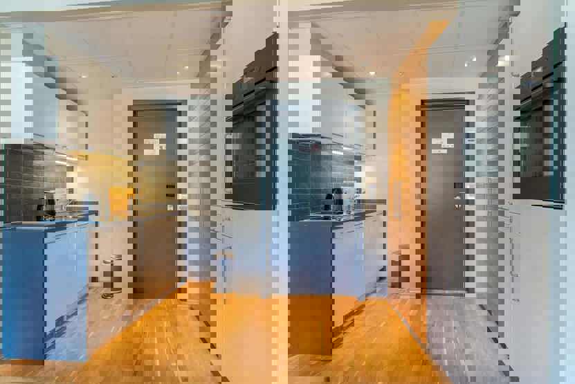 Enheden har komfur, ovn, opvaskemaskine, køleskab.