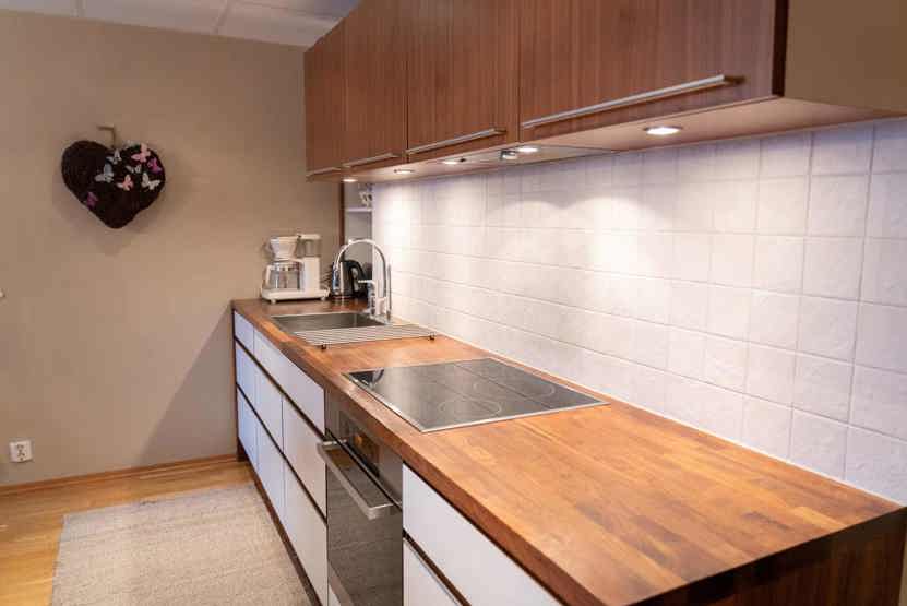 Enheden har komfur med ovn, opvaskemaskine, køleskab.