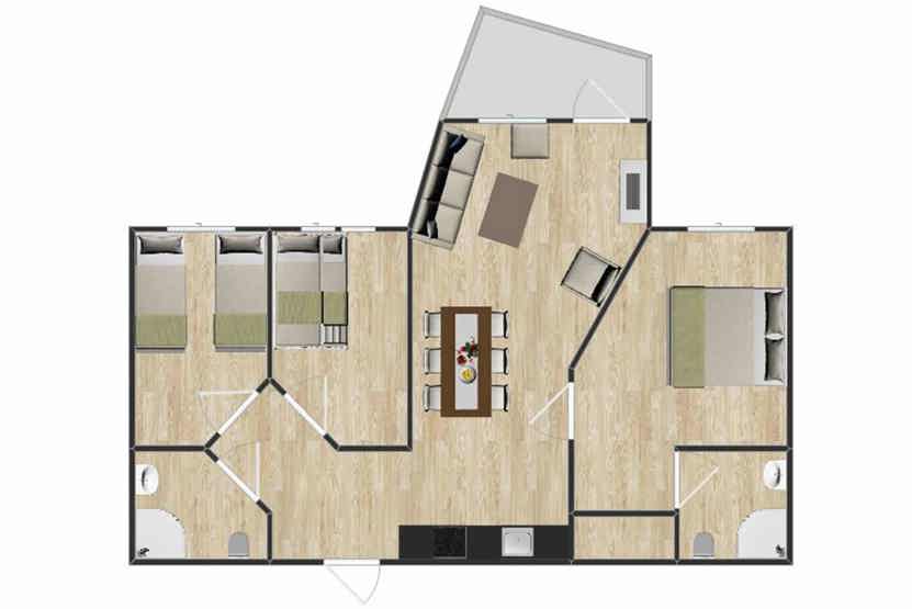 Soveværelse-1= 1 dobbeltseng. Soveværelse-2= 2 enkeltsenge. Soveværelse-3= 1 køjeseng med 120 cm bred underkøje.