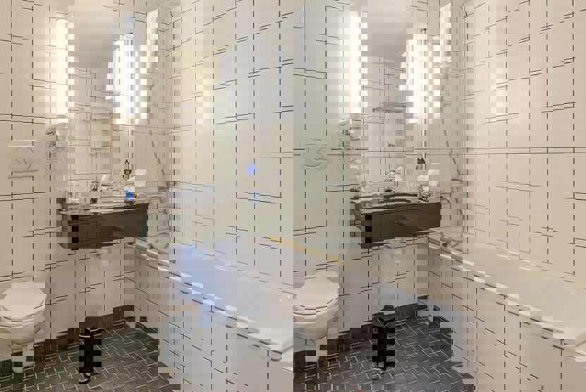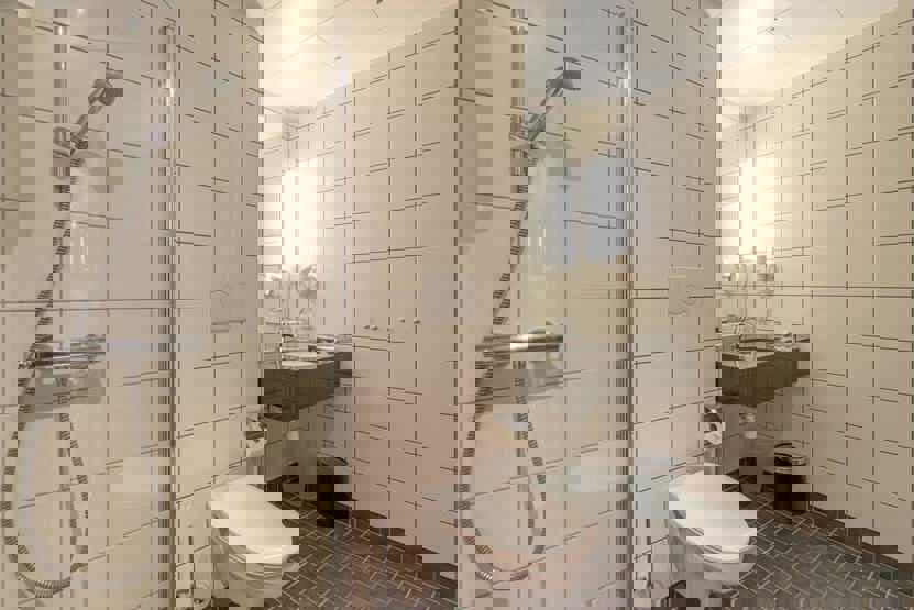 Bad 1 med bruser, WC og badekar. Bad 2 med bruser og WC.