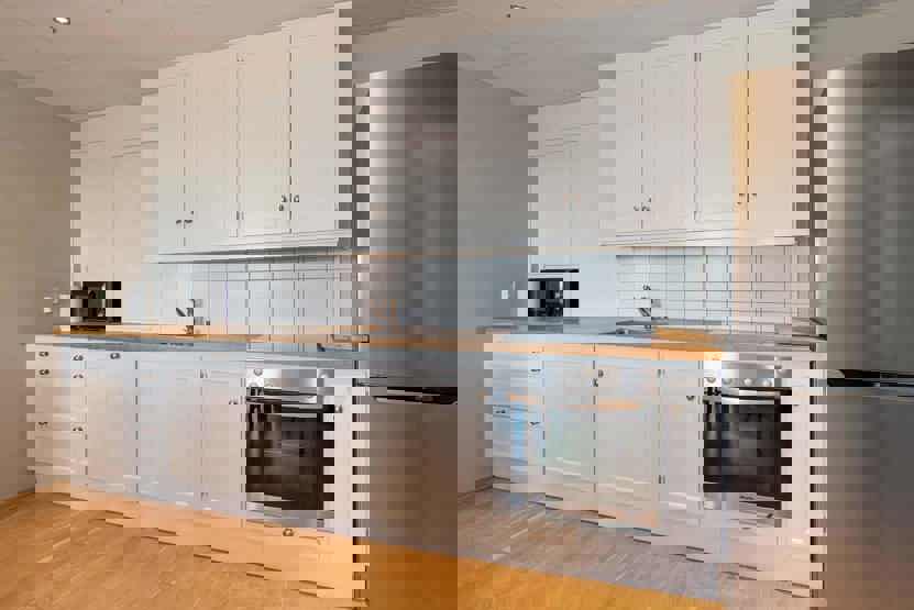 Enheden har komfur med ovn, fryser, opvaskemaskine, køleskab.
