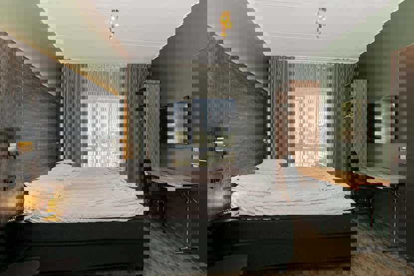 Fra skirummet er der direkte udgang til pisten. 1. klasses betjening i super lækre rammer. Eventyrbad med SPA afdeling med finsk sauna og tyrkisk dampbad mod betaling, Klatrevæg i glas m.m., 6 restauranter og barer, 8 bowlingbaner.