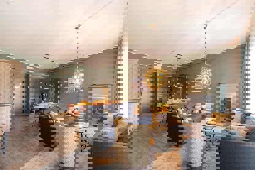 Opholdsstue med 2 sovesofaer, pejs.
