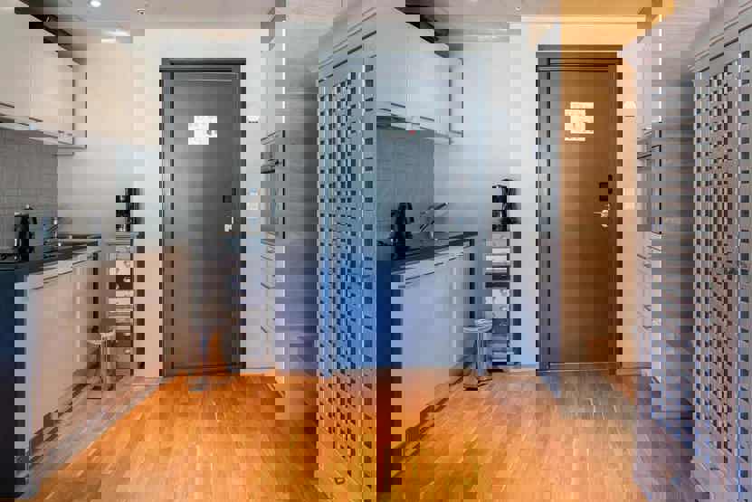 Enheden har 4 el-plader, ovn, opvaskemaskine, køleskab.