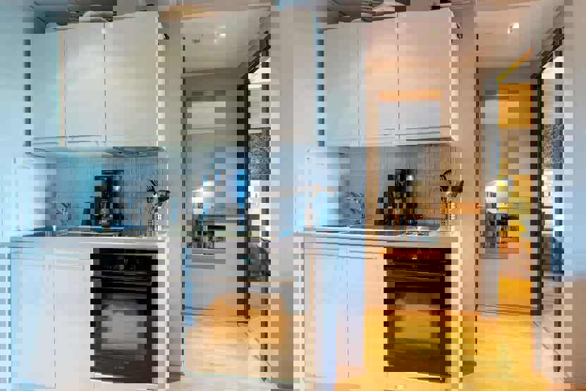 Enheden har komfur, ovn, opvaskemaskine, fryser, køleskab.