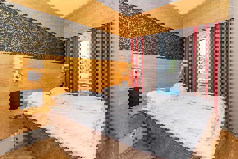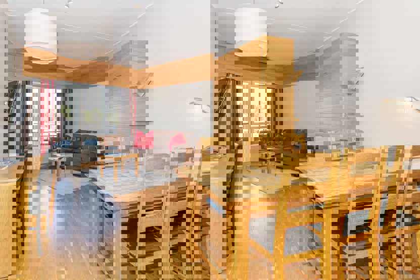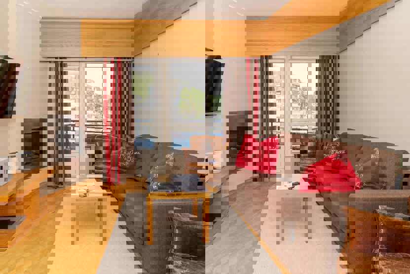 Fra skirummet er der direkte udgang til pisten. 1. klasses betjening i super lækre rammer. Eventyrbad med SPA afdeling med finsk sauna og tyrkisk dampbad mod betaling, Klatrevæg i glas m.m., 6 restauranter og barer, 8 bowlingbaner.