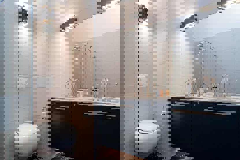 Bad 1 med bruser og WC. Bad 2 med bruser og WC. Bad 3 med WC.