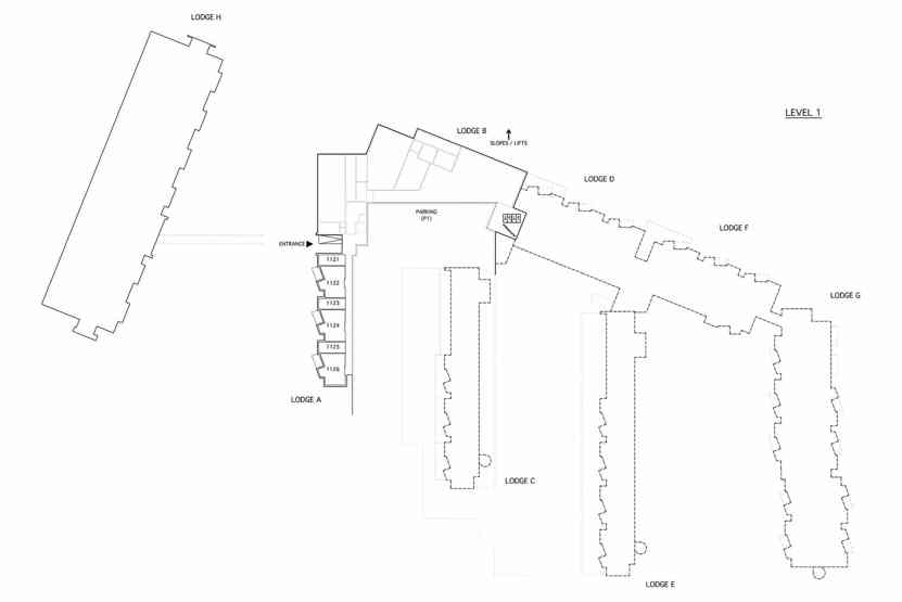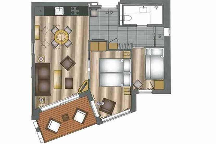 4 personers lejlighed, moderne og med stilfuld indretning. Lejlighed på 1. sal. Lodge A. Opholdsstue med køkkenafdeling. 2 soveværelser. 1 bruser, 1 WC.
