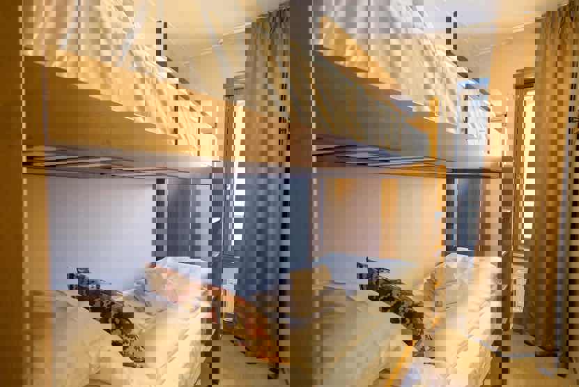 Soveværelse-1= 1 dobbeltseng 180 cm bred. Soveværelse-2= 1 køjeseng med 100 cm bred underkøje og 80 cm bred overkøje.