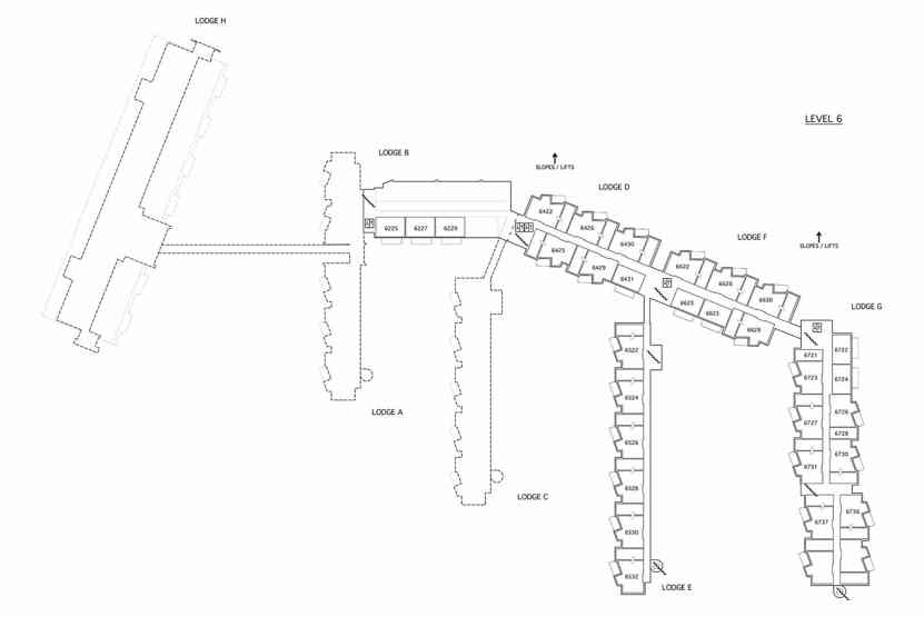 Lejlighed på 6. sal. Lodge F, 70 m². 3 soveværelser. 2 brusere, 2 WC.