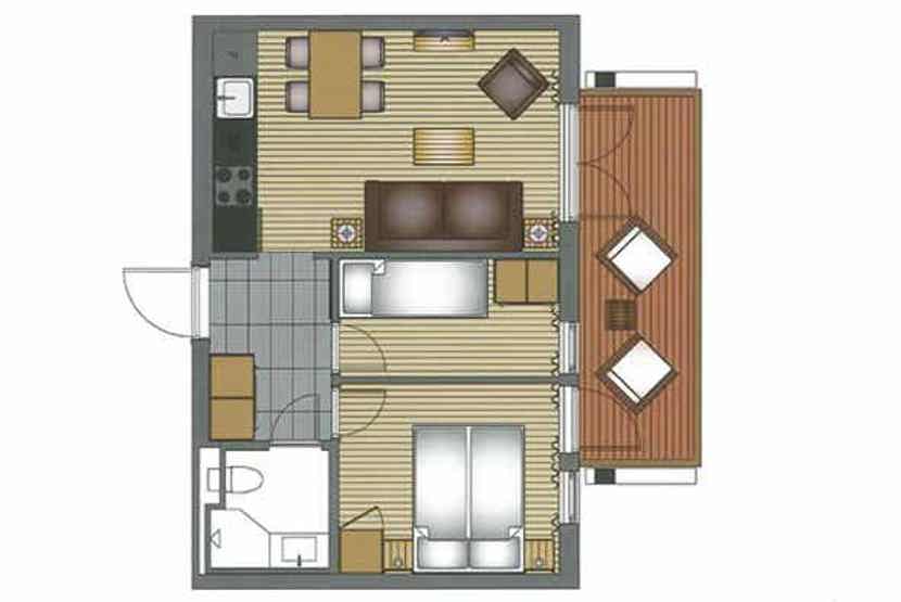 4 personers lejlighed, moderne og med stilfuldt indretning. Lejlighed på 4. sal. Lodge D. Opholdsstue med køkkenafdeling. 2 soveværelser. 1 bruser, 1 WC.