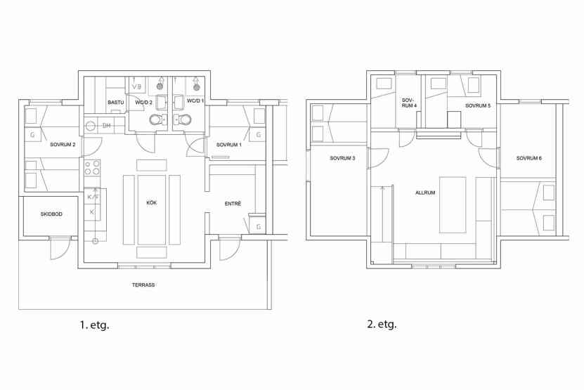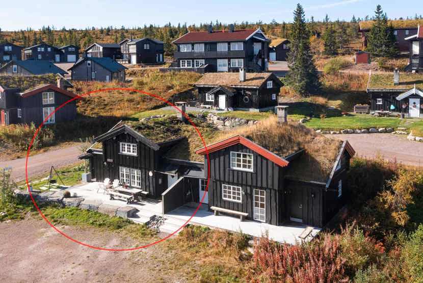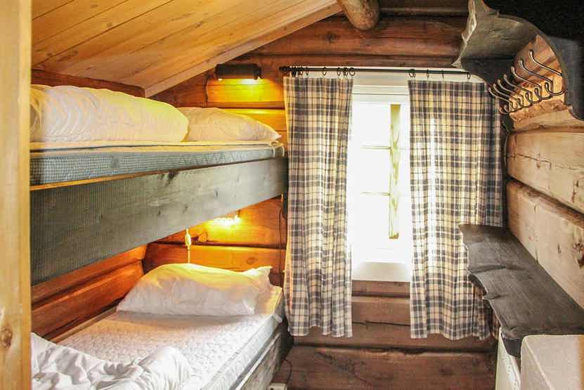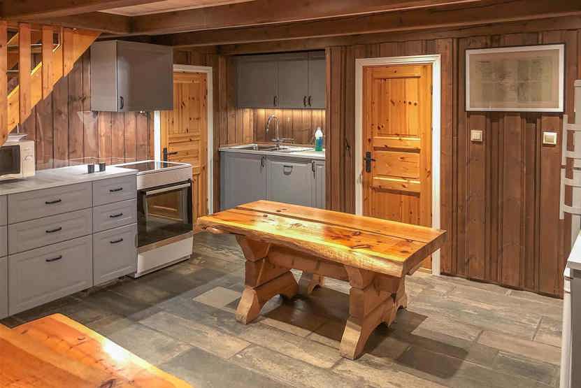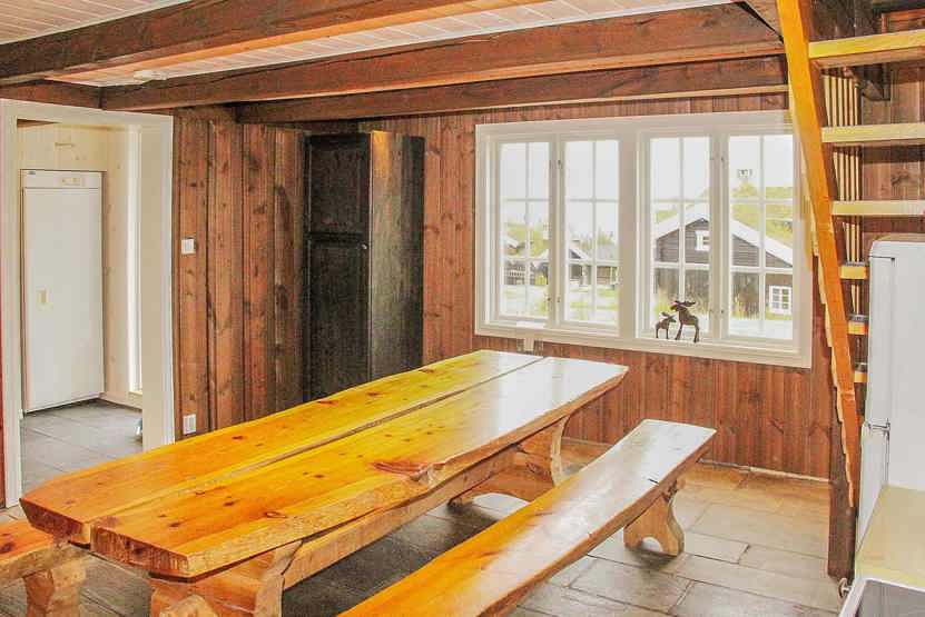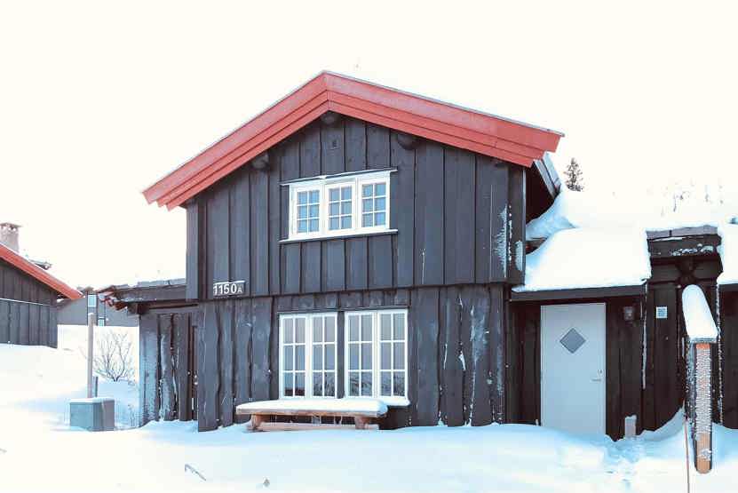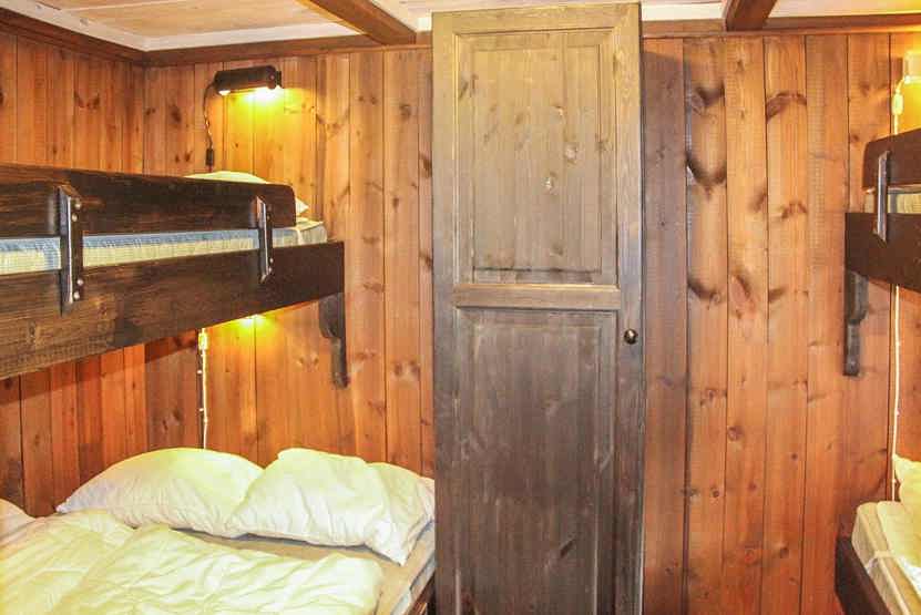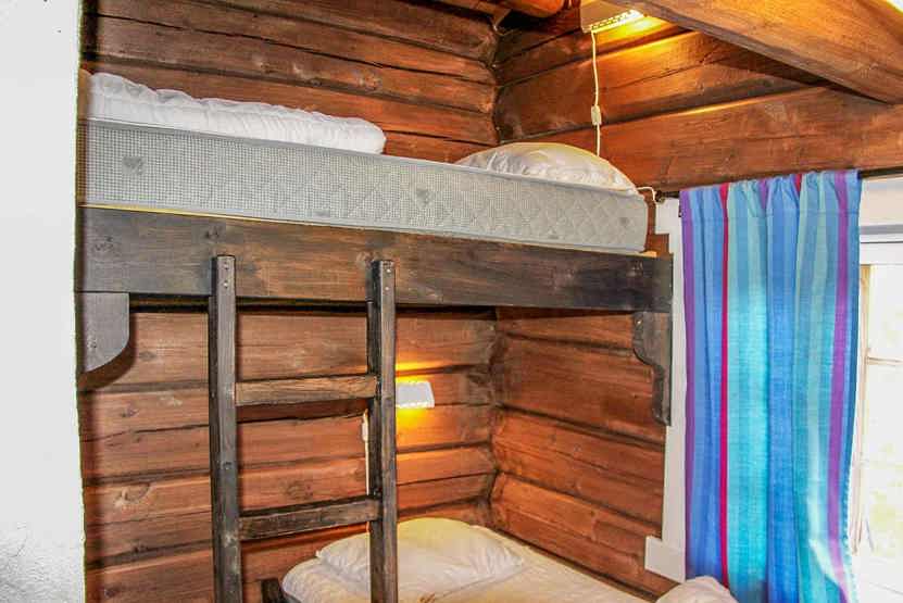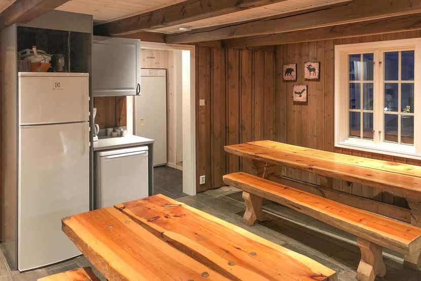 Bjønnhølet Skurufjellet 1150A Enkel hytte med en rustik indretning, på 2 etager med 11+1 sengepladser, 120 m², køkkenafdeling, opholdsstue, pejs, TV, 5 soveværelser, 2 brusere, 2 WC. sauna. Skiopbevaring, tørreskab.